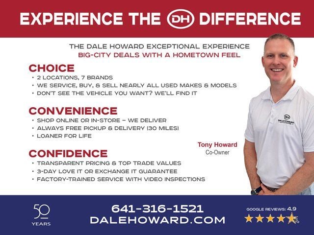 Recent Arrival! The Dale Howard Promise is included at no additional cost to you on all eligible new and used vehicle purchases. Our Promise to you includes 3 Day Exchange, First Oil Change Free, Loaner for Life, and Free Pick Up and Delivery within a 30 mile radius.